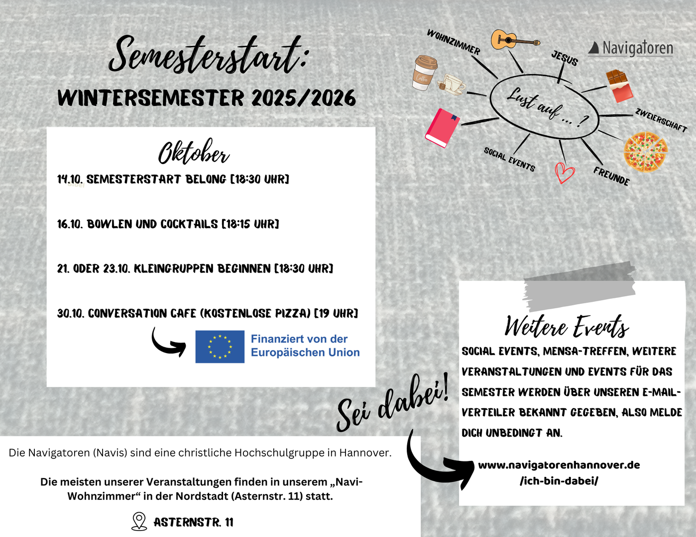 Schreib uns Deine E-mail Adresse und wir schicken Dir eine Mail mit den nächsten Terminen und Treffpunkten unserer Kleingruppen. Diese werden wöchentlich im Navi-Verteiler rum geschickt.